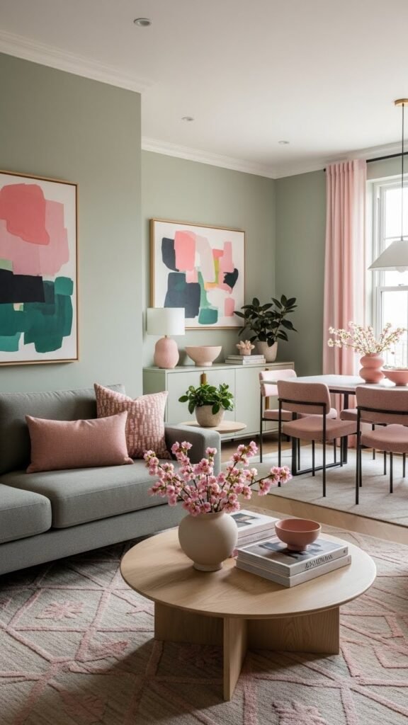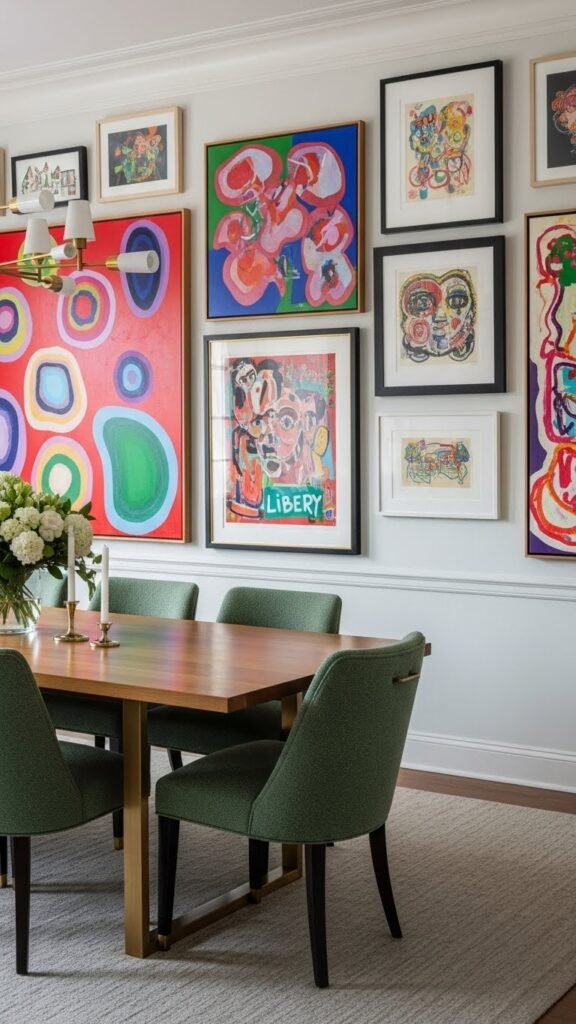 You’ll use sage seating to anchor the table, then introduce art pops—vivid canvases or framed prints—that energize the space.