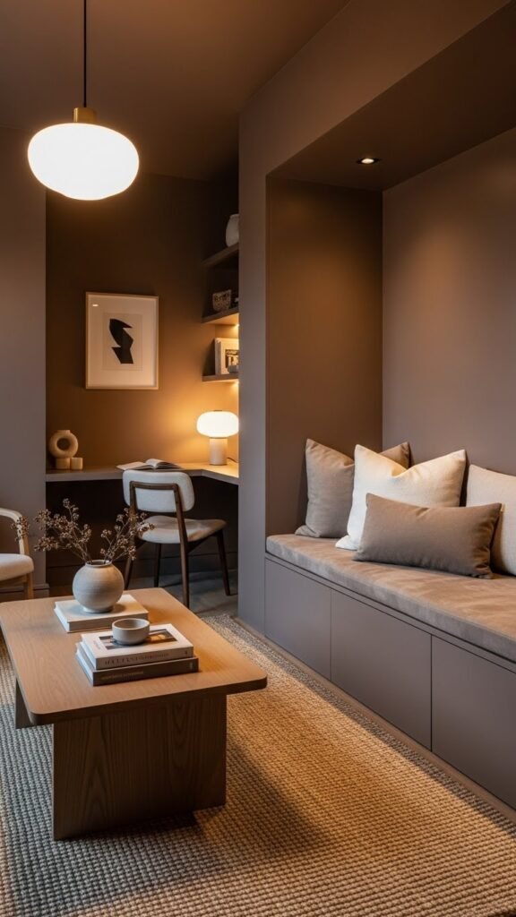 If limoncello brightens and energizes a sunlit office, mocha mousse pulls a room inward, creating a warm, cocooned atmosphere you can actually relax and focus in. Paint floor-to-ceiling to unify space, amplify intimate lighting, and let velvety textures — matte wood, suede cushions — read richer. You’ll carve a liberated, restorative nook that still feels modern and intentional.
