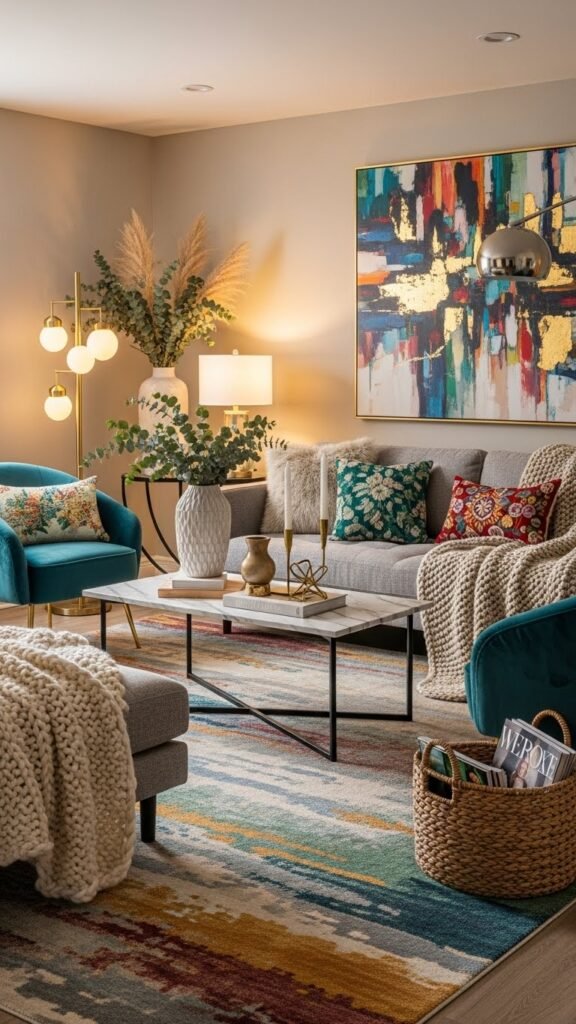 You’ll use a muted jewelmix—soft emeralds, dusty sapphire, warm garnet—set against neutral grounding like oat, stone, or warm beige. That contrast frees you to mix modern furnishings, layered textures, and bold accents without overwhelming the space.