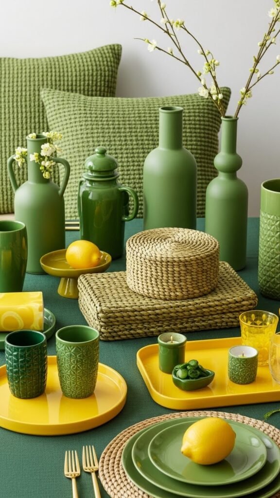Although spring calls for lighter layers, you’ll get the freshest seasonal boost by pairing matcha greens with lemon accents in your accessories—think ceramic vases, throw pillows, and small trays—so the palette feels both lively and composed.