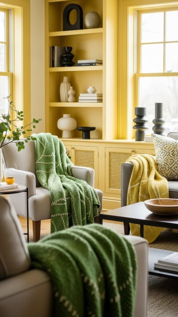 Pairing buttery yellow trim with your matcha and lemon accents brings warmth that binds the scheme without overwhelming it. You’ll edge shelves or window casings with buttery trim, then layer textured throw blankets in complementary greens and soft lemons.