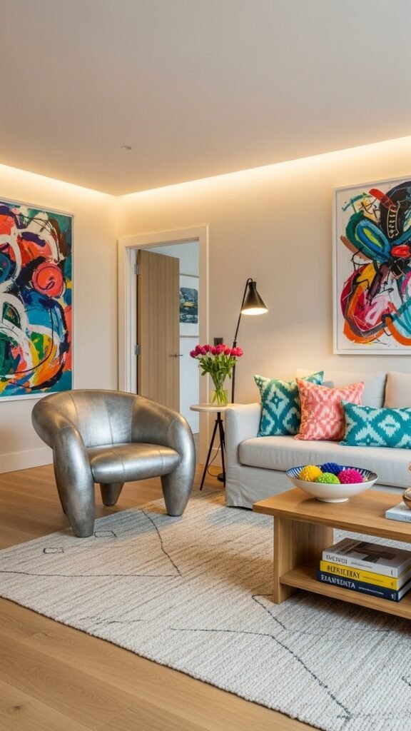You’ll layer neutral textiles, lean on ambient lighting, and add bold accessories—art, cushions, a sculptural chair—to create flow, freedom, and focused pops without overwhelming the open plan.