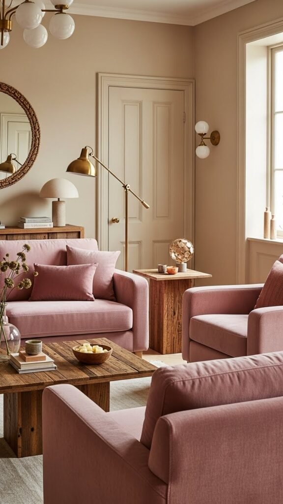 When you introduce dusty rose upholstery into a warm beige living space, the soft, muted pink brings instant warmth and a modern vintage vibe while brass and wood finishes ground the look with shine and organic texture.