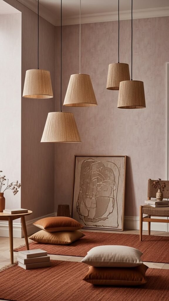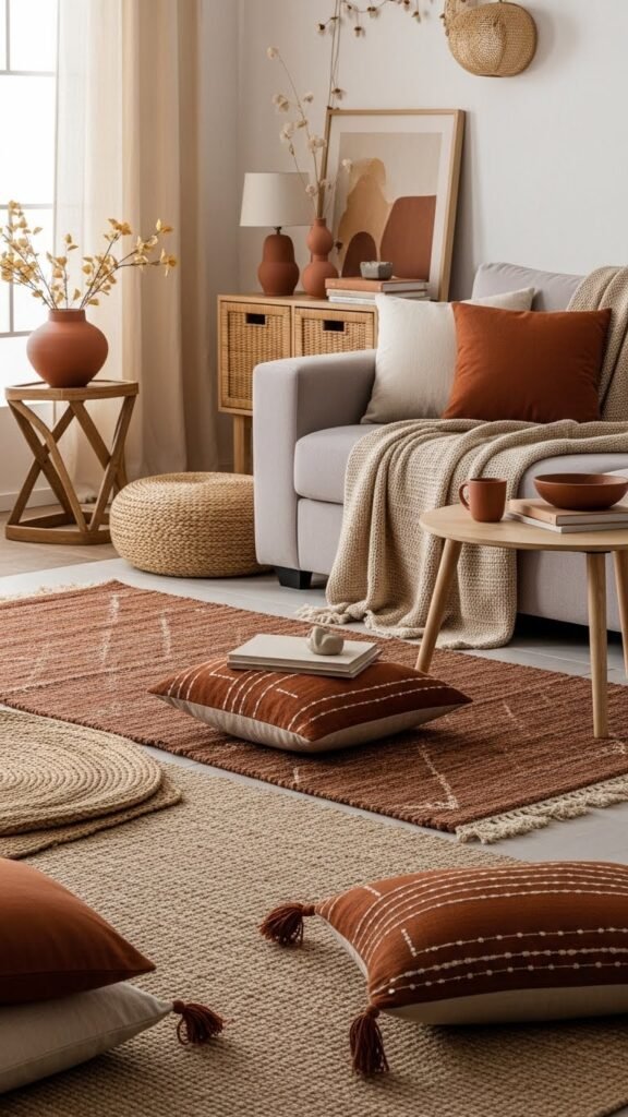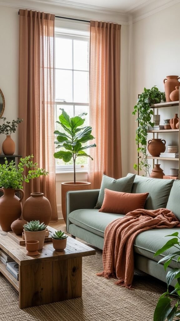You’ll mix textured throws, clay pottery, and linen curtains in earthy terracotta tones, then balance them with muted sage upholstery and plants. The result feels liberated, refined, and quietly confident.