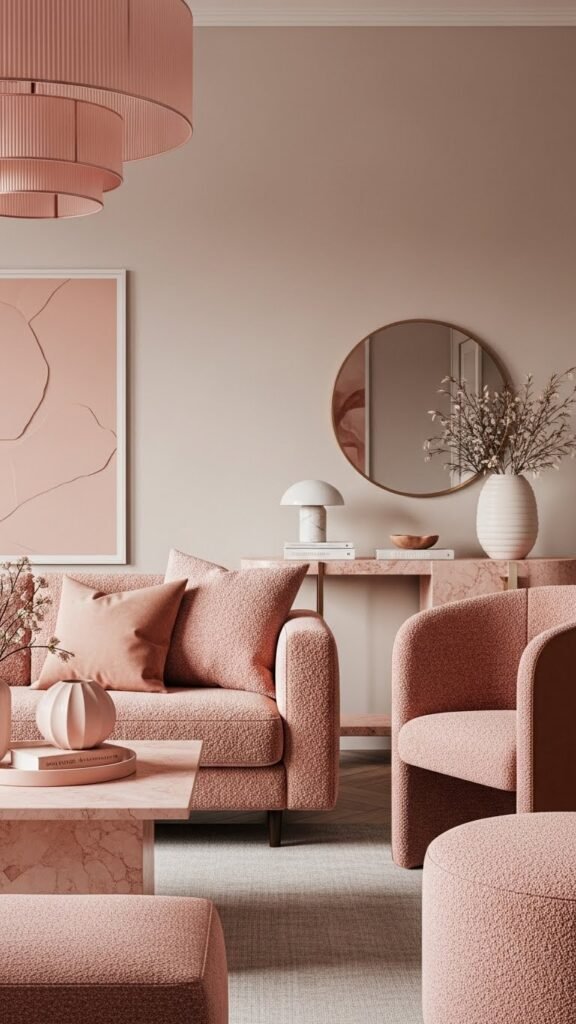 Shifting from terracotta and sage, bring soft femininity into the room with blush pink accents paired with warm browns to create a cozy, modern balance. You’ll use blush brown upholstery, layered textures like boucle and leather, and porcelain accents for subtle sheen.