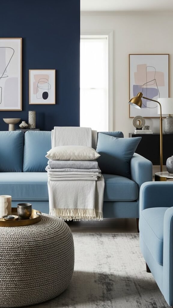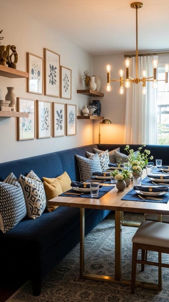 Navy sets a grounded backdrop in the dining room, and you can carry that calm into the living area with a powder blue velvet sofa that reads airy yet luxe. Anchor it with a textured ottoman for tactile contrast, layer linen throws and minimalist art, and add vintage brass accents to punctuate warmth. Choose pieces that let you move, breathe, and live freely.