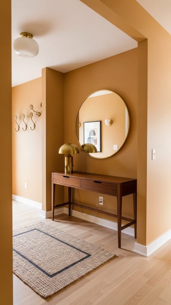 When you step through the door, let ochre set a warm, unexpected tone while brass details catch the light and guide the eye; together they create an entry that feels curated yet effortless. You’ll pair ochre accents with streamlined brass silhouettes—a mirror, console lamp, or hooks—to declare a confident welcome.