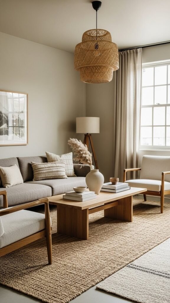 You’ll lean into almond accents and tactile jute textures, choosing streamlined pieces that honor craftsmanship and let you move freely, uncluttered by excess.