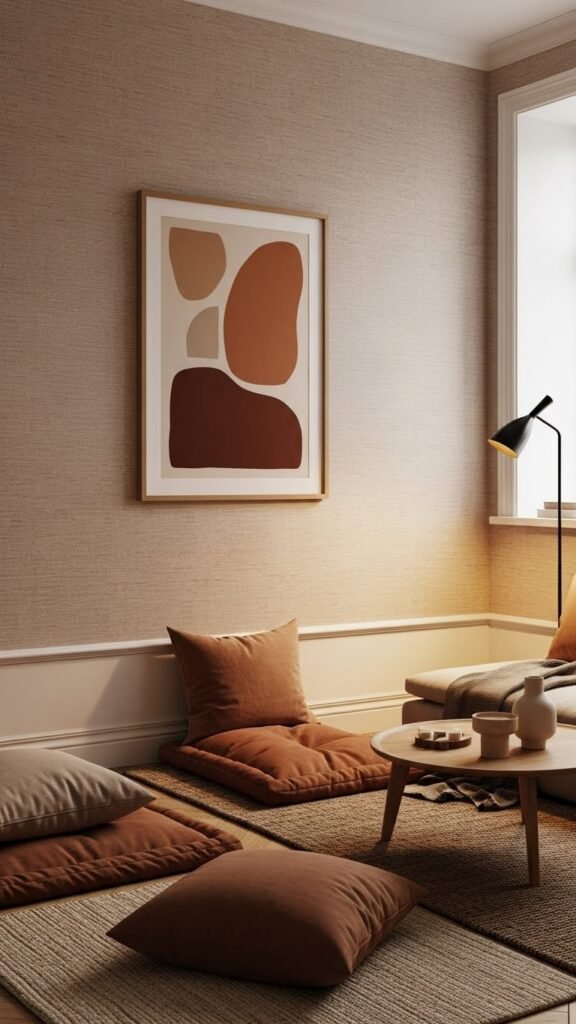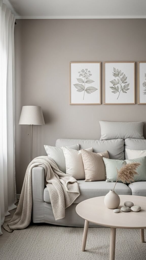 A soft taupe backdrop grounds the room while keeping the mood light, and muted botanical prints add subtle life without stealing the calm. You’ll choose matte taupe walls to create a liberated canvas, layer botanical silhouettes in soft frames, and introduce linen textures through cushions and throws.