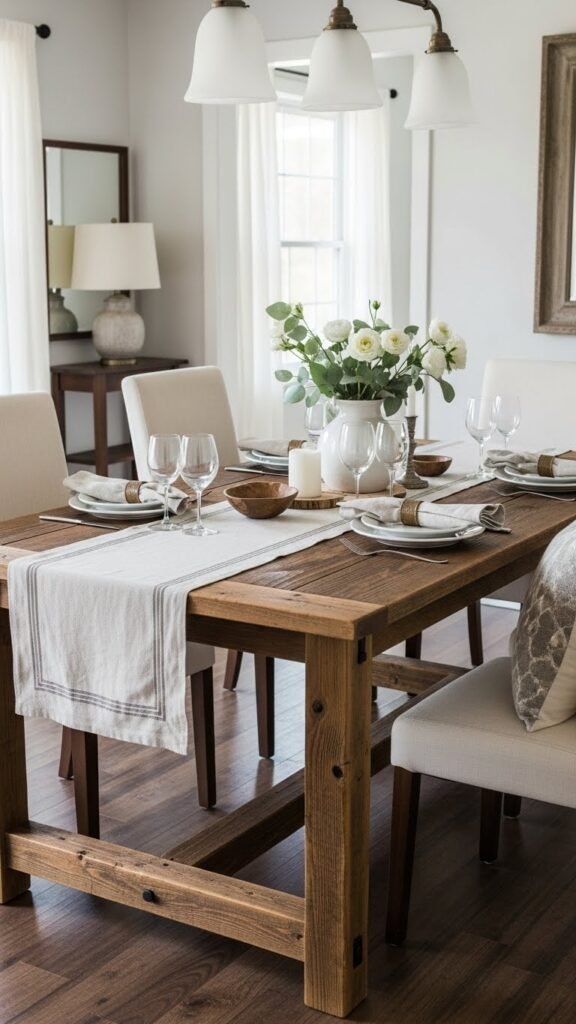 Move from the soft botanical focus to a tactile centerpiece by anchoring your dining area with a reclaimed wood table topped with simple linen runners. You’ll celebrate reclaimed craftsmanship that’s rugged yet refined, pairing it with effortless linen styling to keep things light.