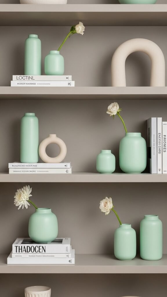 Set mint green vases against neutral shelving to add a cool, sophisticated pop without overpowering the room.