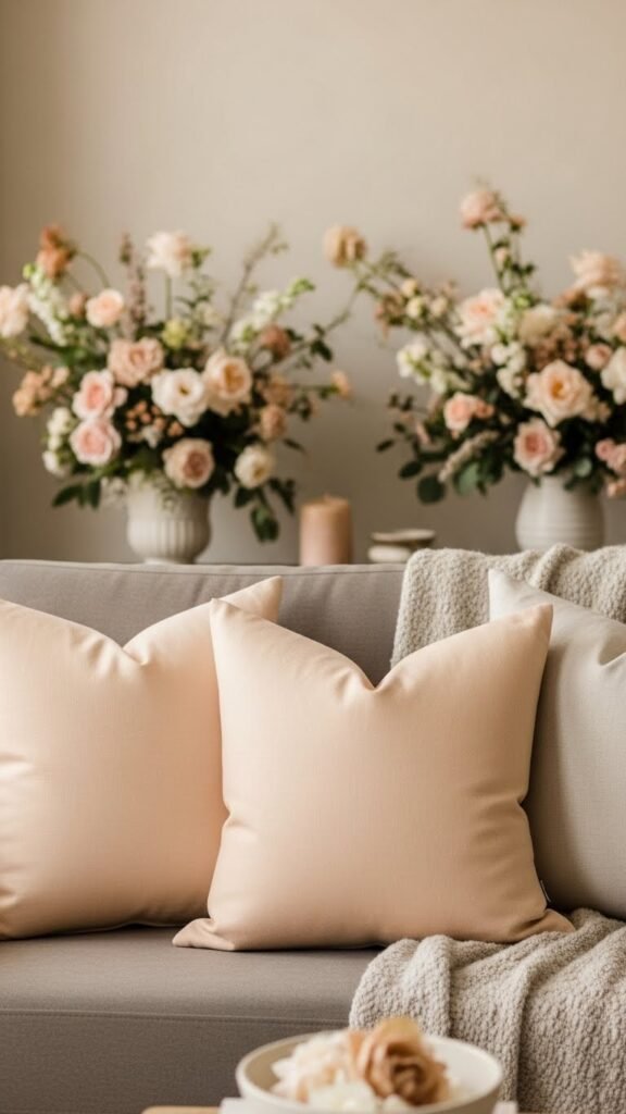 Warm up a neutral room with pale peach throw pillows and oversized florals to introduce a soft, optimistic note that still reads sophisticated. You’ll balance peachy texture against linen or wool neutrals, letting bold floral scale anchor a sofa or bed without overwhelming.