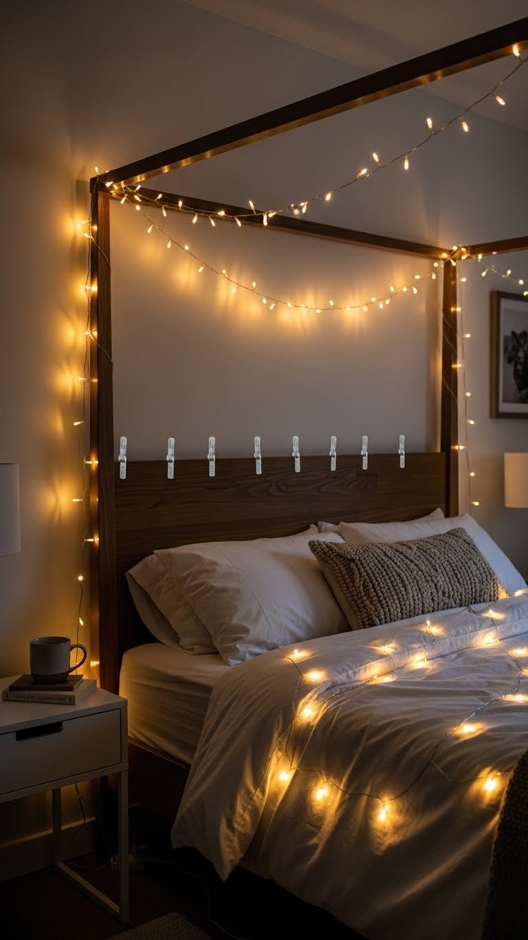Against a simple headboard, stringing fairy lights along the bed frame instantly softens the room and sets a subtly romantic mood.