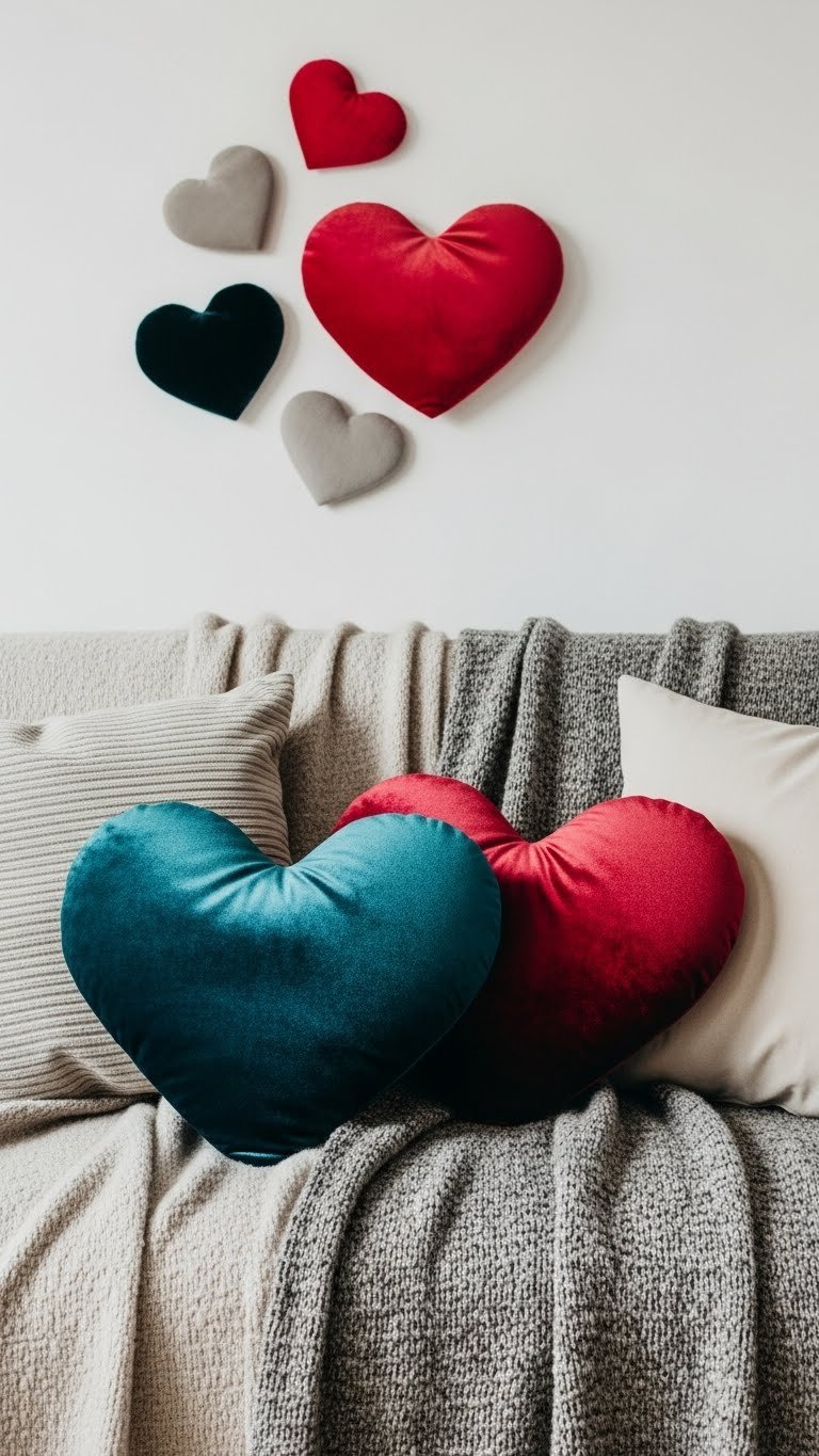 You’ll mix jewel tones and neutral throws, let velvet textures catch light, and place varied heart silhouettes for curated contrast. They’re bold, tactile accents that invite touch and personal freedom.