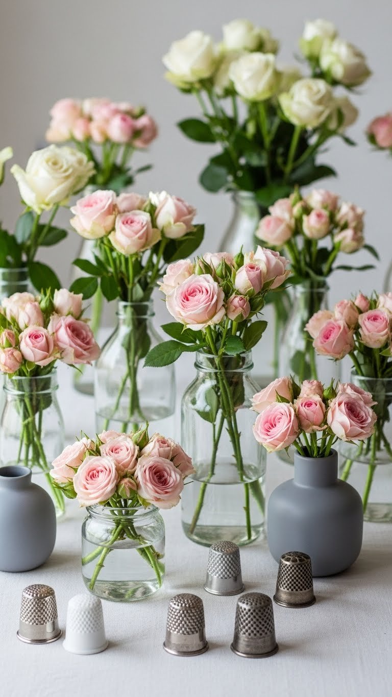 You’ll place tiny mini rosebuds in assorted vessels—thrifted glass, porcelain thimbles, or matte bud vases—to create effortless table accents.