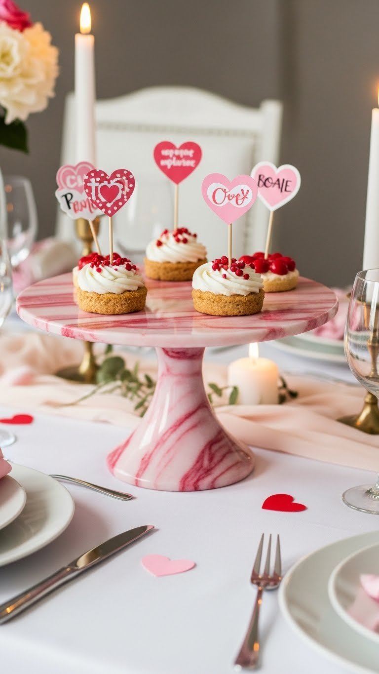 Set a pink marble cake stand at the center of your table to anchor your Valentine’s spread—its rosy veining and glossy surface instantly elevate desserts and decor alike.
