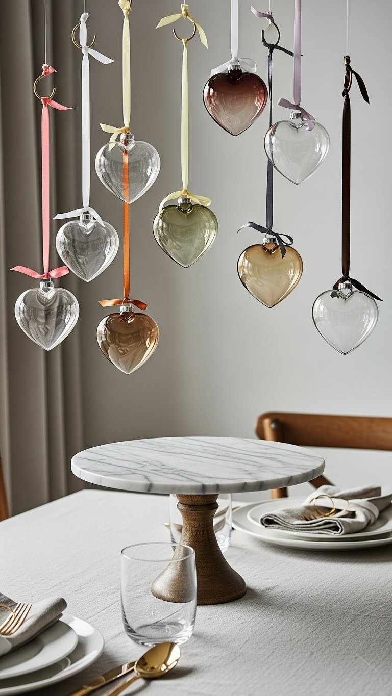 After your marble cake stand anchors the table, hang glass heart ornaments above it to add vertical romance and catch the light.