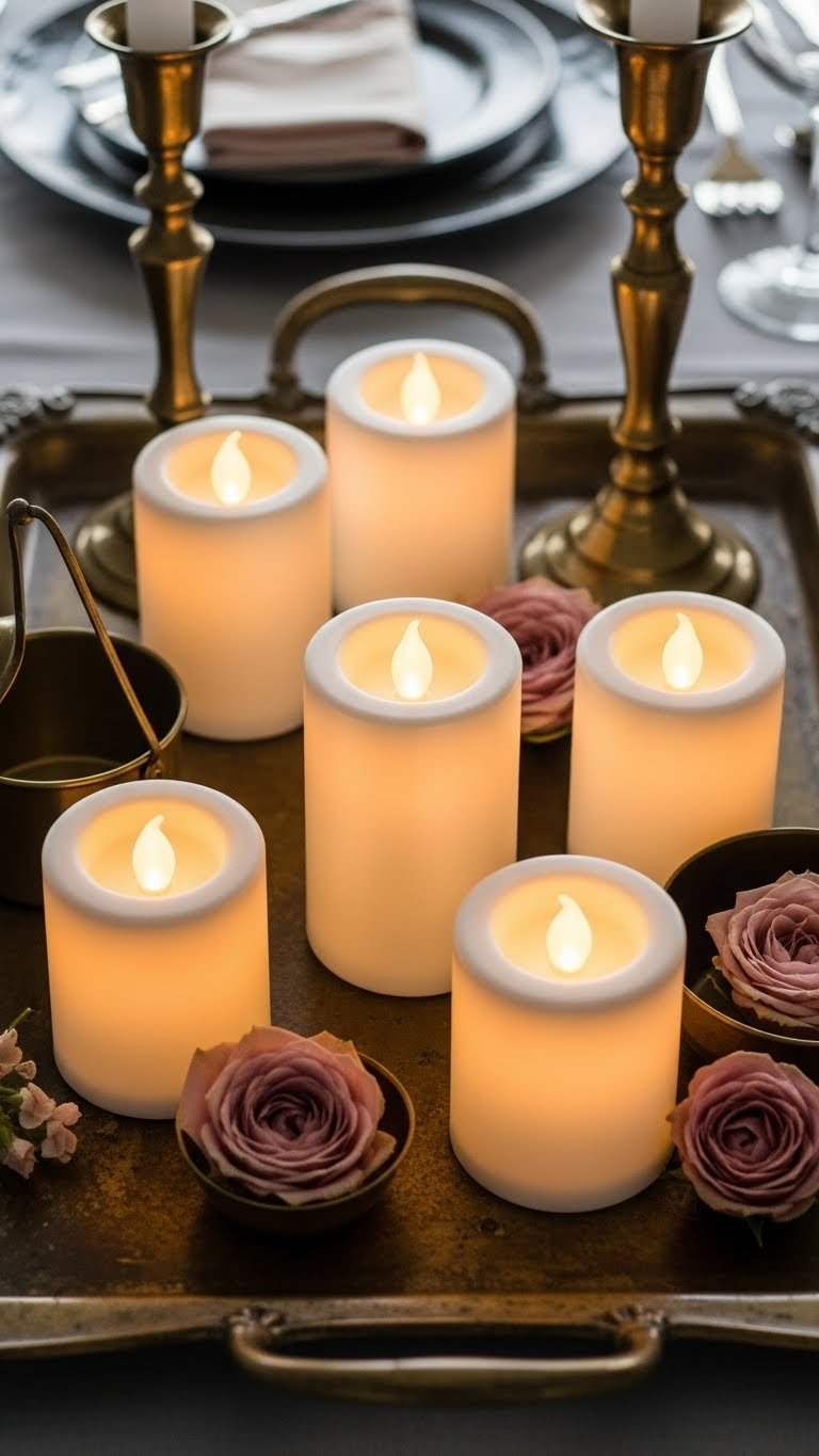 Layer LED votives into a vintage tray to instantly warm your table with soft, flicker-free glow. You’ll craft an antique trayscape that feels curated but effortless, mixing brass, patina, and muted roses.
