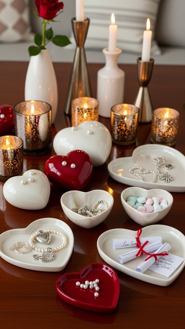 Glossy pearl-accented tabletop hearts bring a chic, tactile note to your Valentine spread, catching candlelight and softening modern lines. Place small pearl bowls beside heart trays for jewelry, mints, or love notes; mix matte and iridescent finishes to keep things unexpected.