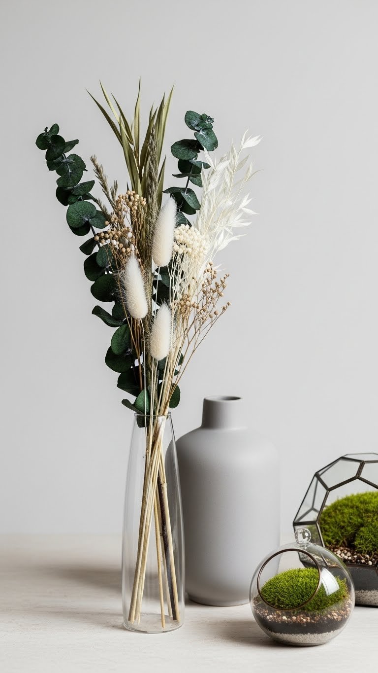 Often you’ll find preserved stems give you the drama of fresh florals without the upkeep, so arrange them in slim glass or matte ceramic vases to let texture and color do the talking.