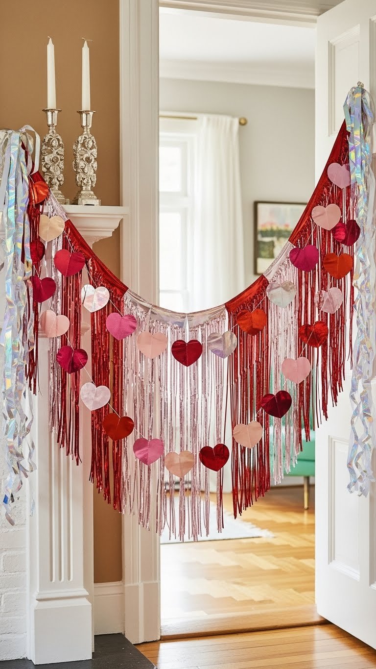 Spark a playful, retro-chic vibe with a tinsel heart party garland that shimmers from mantle to doorway. You’ll drape lightweight hearts threaded on metallic fringe for kinetic sparkle, mixing rose, crimson and pearlescent tones. Tie ends with holographic ribbon for instant glow. It’s bold but effortless—you’ll hang, layer, and rearrange to suit your mood and celebrate freely.