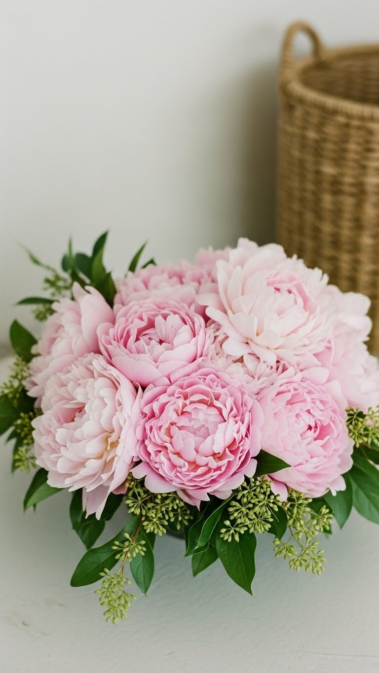After guests browse the woven basket, bring their attention to a low, luxe pink peony bundle centerpiece that anchors the table with soft volume and effortless romance.