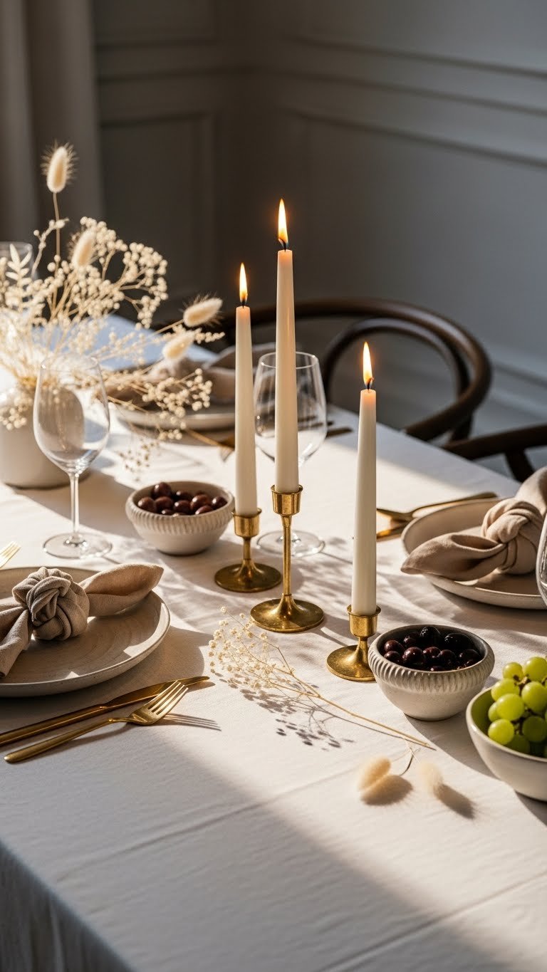 You’ll choose scented tapers for atmosphere and pair them with a brass trio of holders to add polish. Arrange asymmetrically, leave negative space, and let soft candlelight define your evening—effortless, liberated, unmistakably chic.
