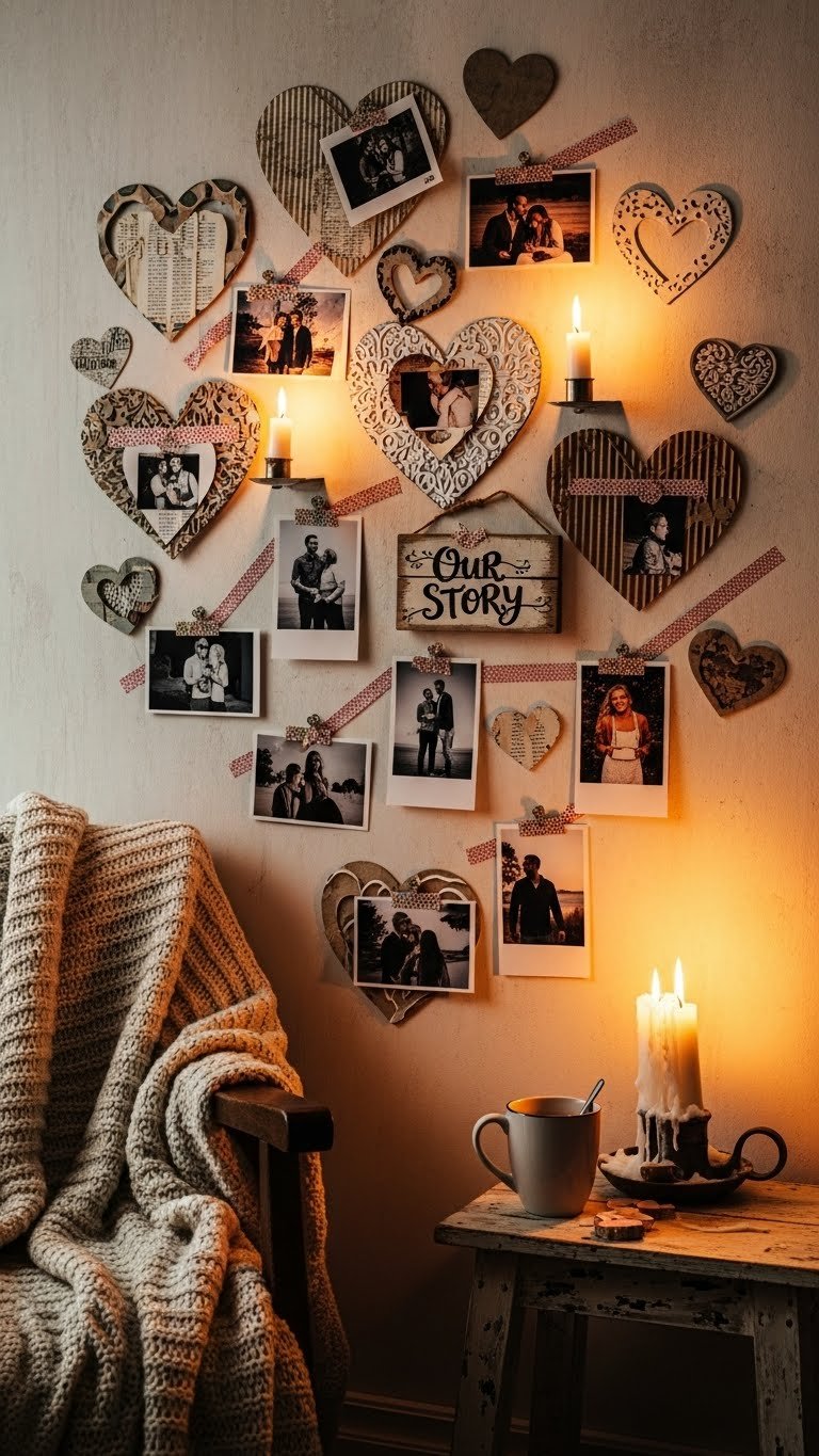 Move the eye from the soft pool of candlelight to a wall that tells your story: a DIY paper heart photo wall turns intimate moments into art.