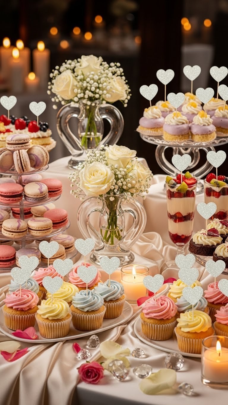 After your love vases set the mood on the table, bring that same sculptural romance to the dessert plate with glitter heart picks that sparkle against frosting and fruit.