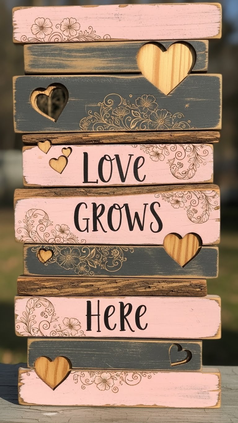 Anchor your vignette with a heart-themed wood sign that blends rustic warmth and modern minimalism—think raw-edge planks painted in muted pinks or charcoal, with laser-cut hearts or hand-painted lettering for a bespoke touch.