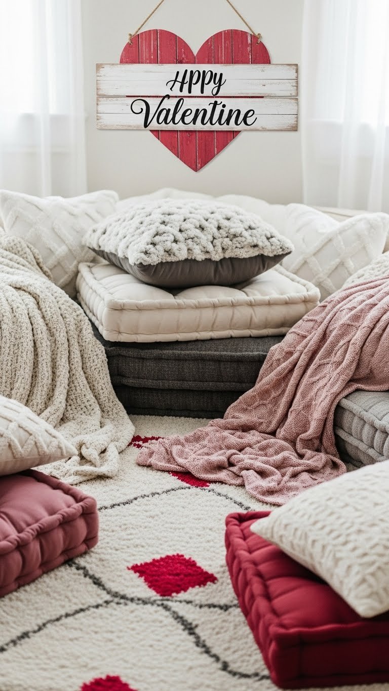 Let the heart-themed wood sign set the tone, then pull the eye down to a cozy rug nook layered with plush floor cushions that invite lingering conversations and lazy afternoons.