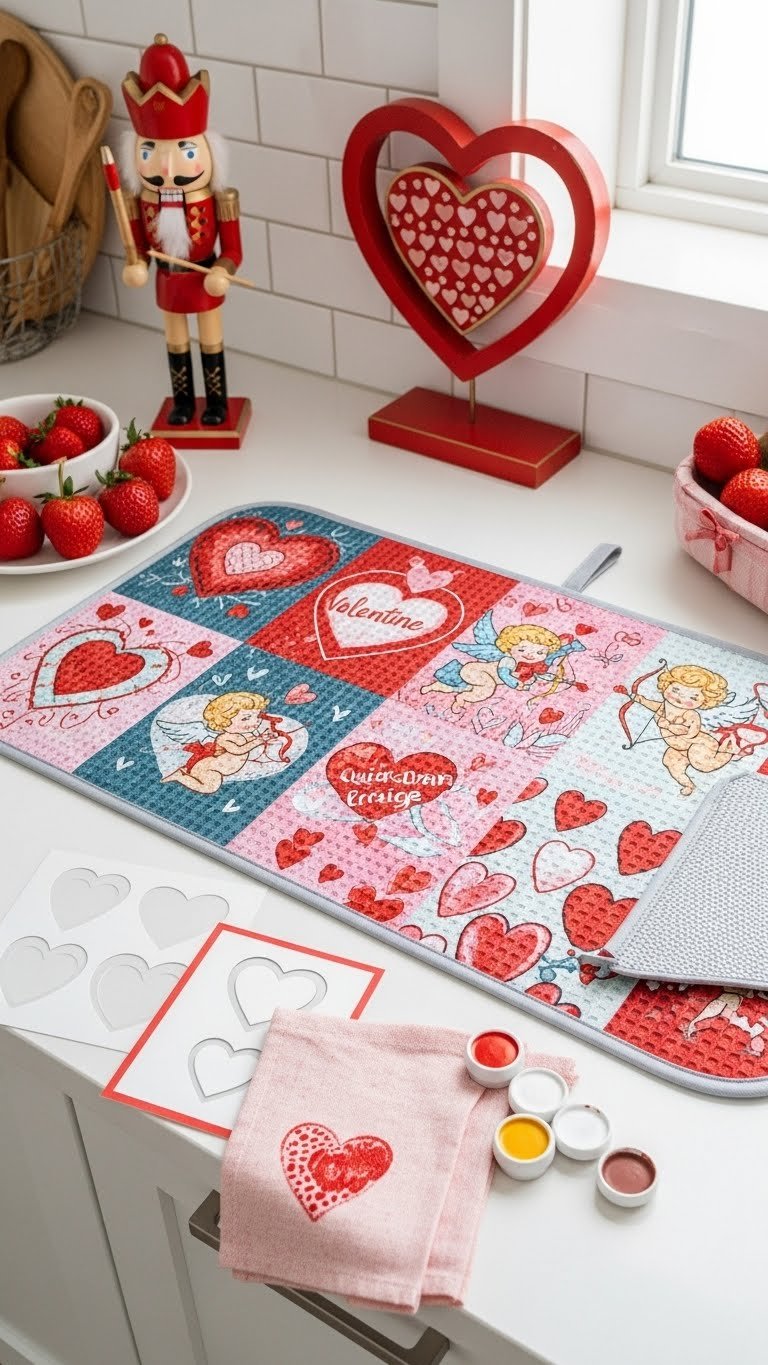 After your heart-shaped nutcracker vignette steals the show, keep the Valentine thread going in the kitchen with a drying mat that wears the season like an accessory.
