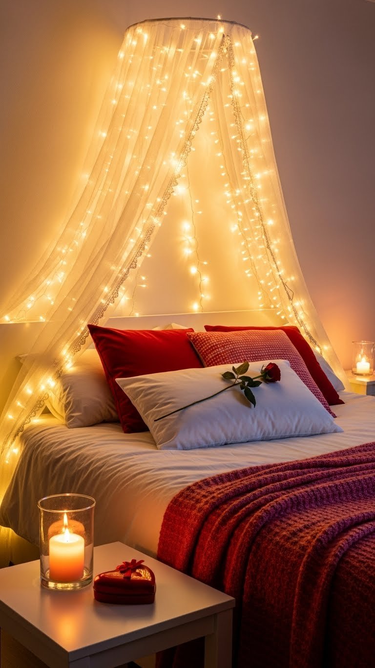 Drape fairy lights above the bed to create an intimate, dreamy canopy that instantly transforms your apartment for Valentine’s Day. You’ll craft a twinkle canopy that feels both liberated and luxurious, framing the headboard like a bedside curtain.