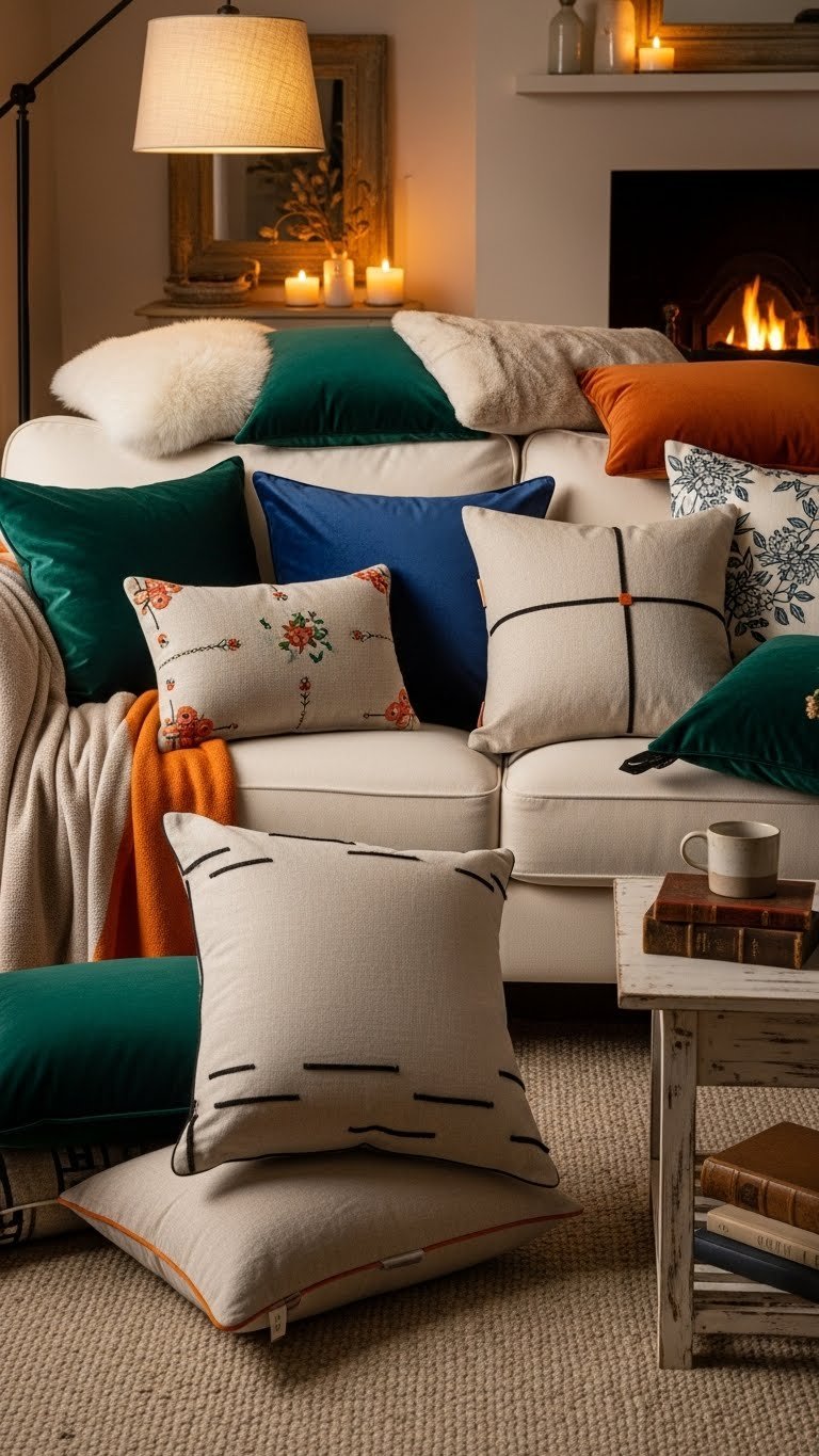 You’ll choose cushions that embrace textured layering—velvet, faux fur, linen—then arrange bold shapes and sizes.
