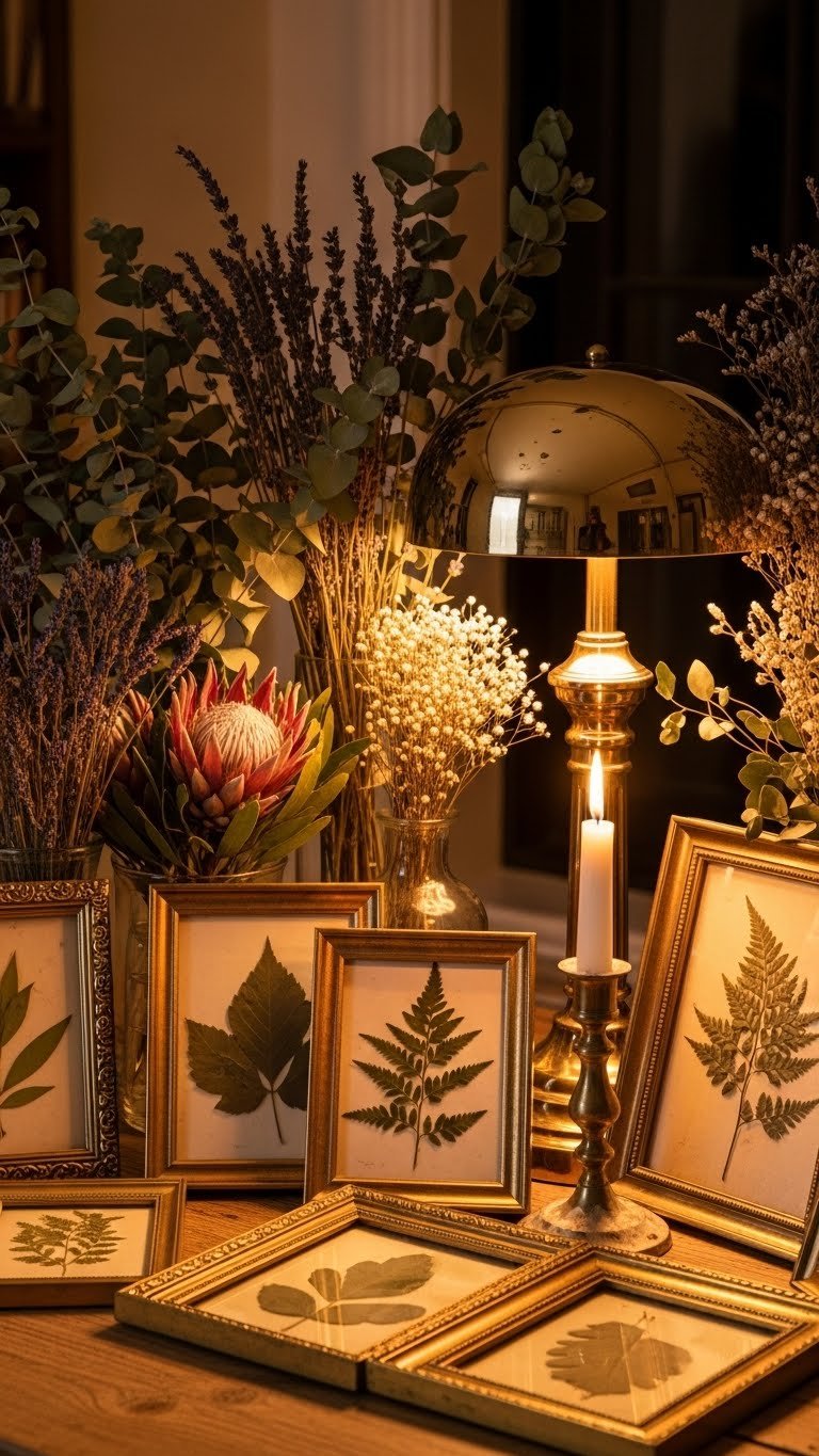 After arranging your dried blooms and herbarium accents, bring in brass and warm metals to lift the mood and add glow. You’ll choose pieces with polished hardware for subtle shine and objects sporting a warm patina to suggest intimacy.