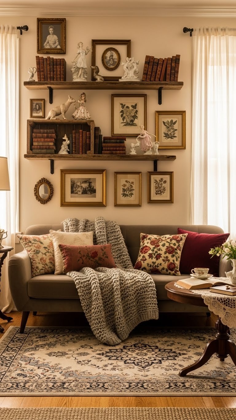 Choose antique frames for gallery walls, tuck porcelain figurines on shelves, and layer textured textiles for contrast. You’ll balance nostalgia and modern freedom by editing pieces carefully, keeping surfaces uncluttered, and letting each heirloom speak without overpowering the room’s romantic flow.