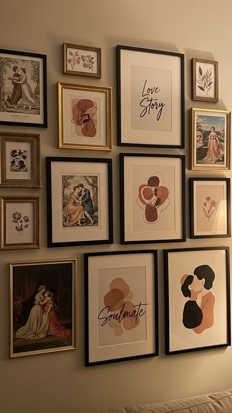 A gallery wall of romantic artwork turns a plain wall into the emotional centerpiece of your apartment, so choose pieces that speak to the mood you want to live in.