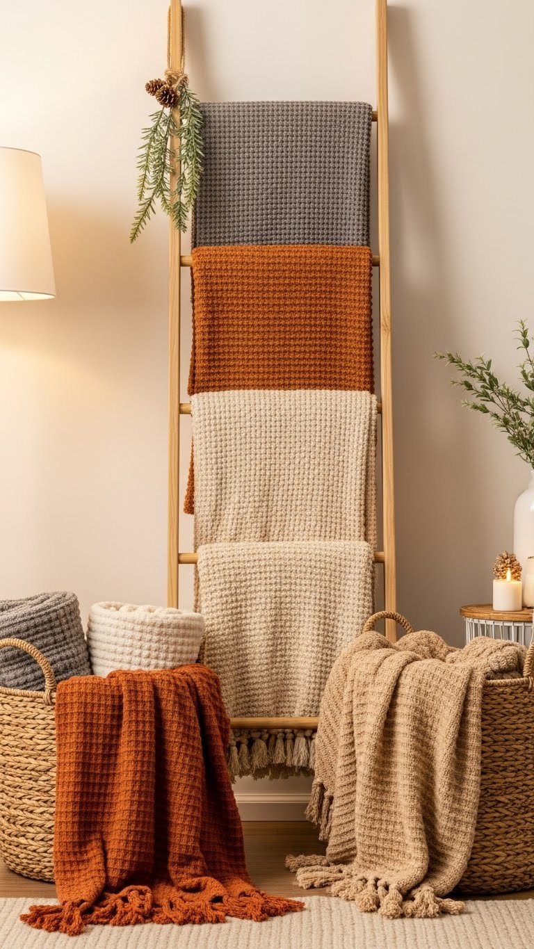 Often you’ll reach for a blanket ladder or woven basket when you want storage that doubles as decor; both keep throws accessible while adding texture and warmth to your space.