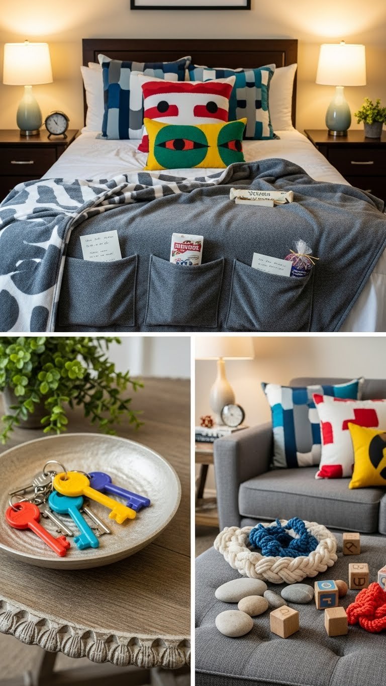 Want to spark playful surprises around the apartment? Use peekaboo pillows with bold patterns that reveal contrasting fabrics when flipped, and incorporate hidden pockets in throws or ottomans for tucked notes, small treats, or tactile trinkets. You’ll create spontaneous delight without clutter.