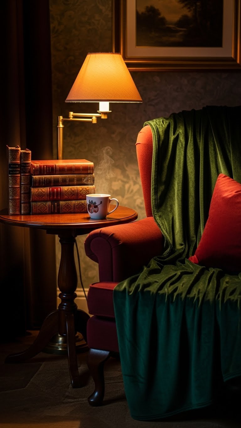 Cozy Dark Academia Reading Nook With Velvet Throws