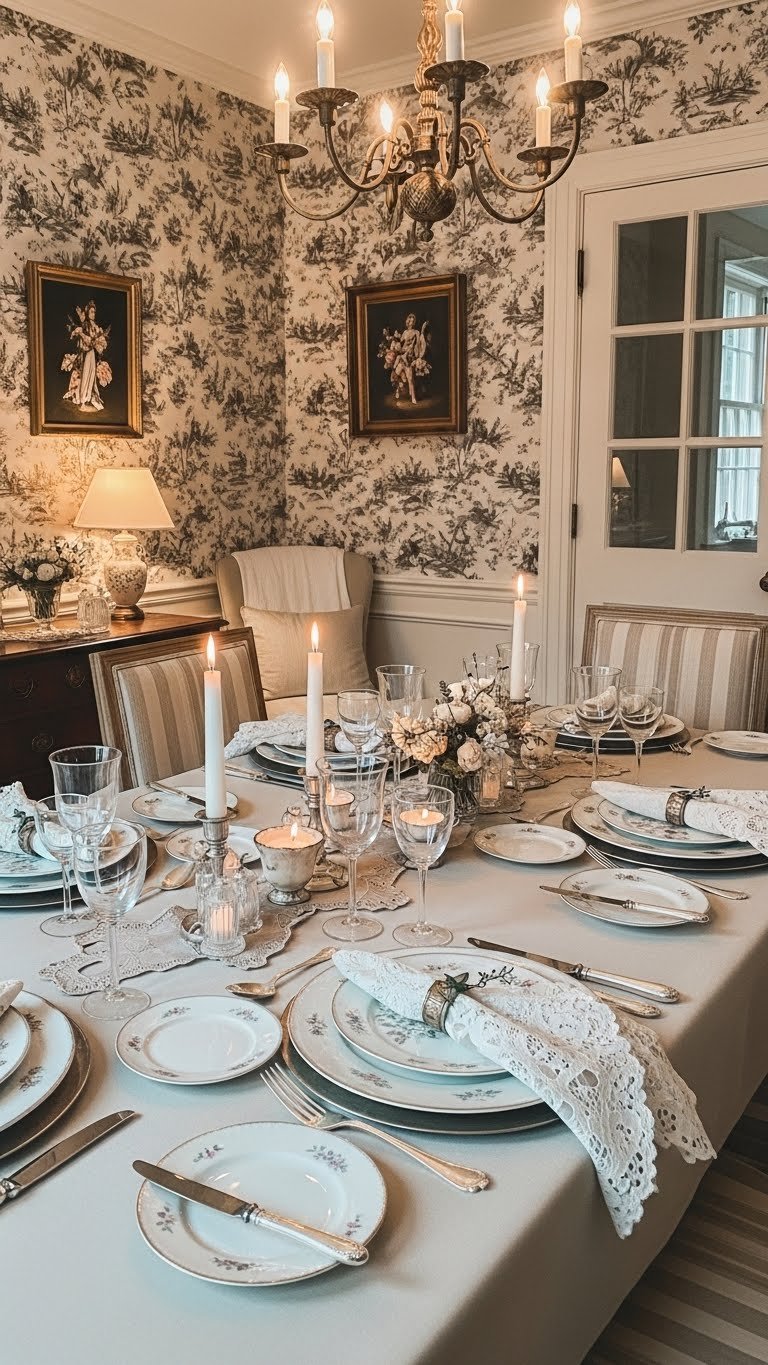 When you refresh your dining room for winter with Grandmillennial toile, embrace timeless patterning and layered formality that still feels fresh and livable. You’ll pair toile wallpaper with heirloom lace napkins, aged silver, and muted florals on bone china.