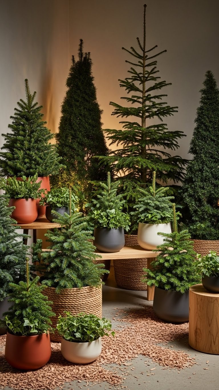 Bring a breath of winter woodland indoors with a biophilic evergreen corner anchored by potted firs, and let textured greenery soften hard edges while grounding your space. Position varied heights, woven baskets, and matte ceramic pots for contrast.