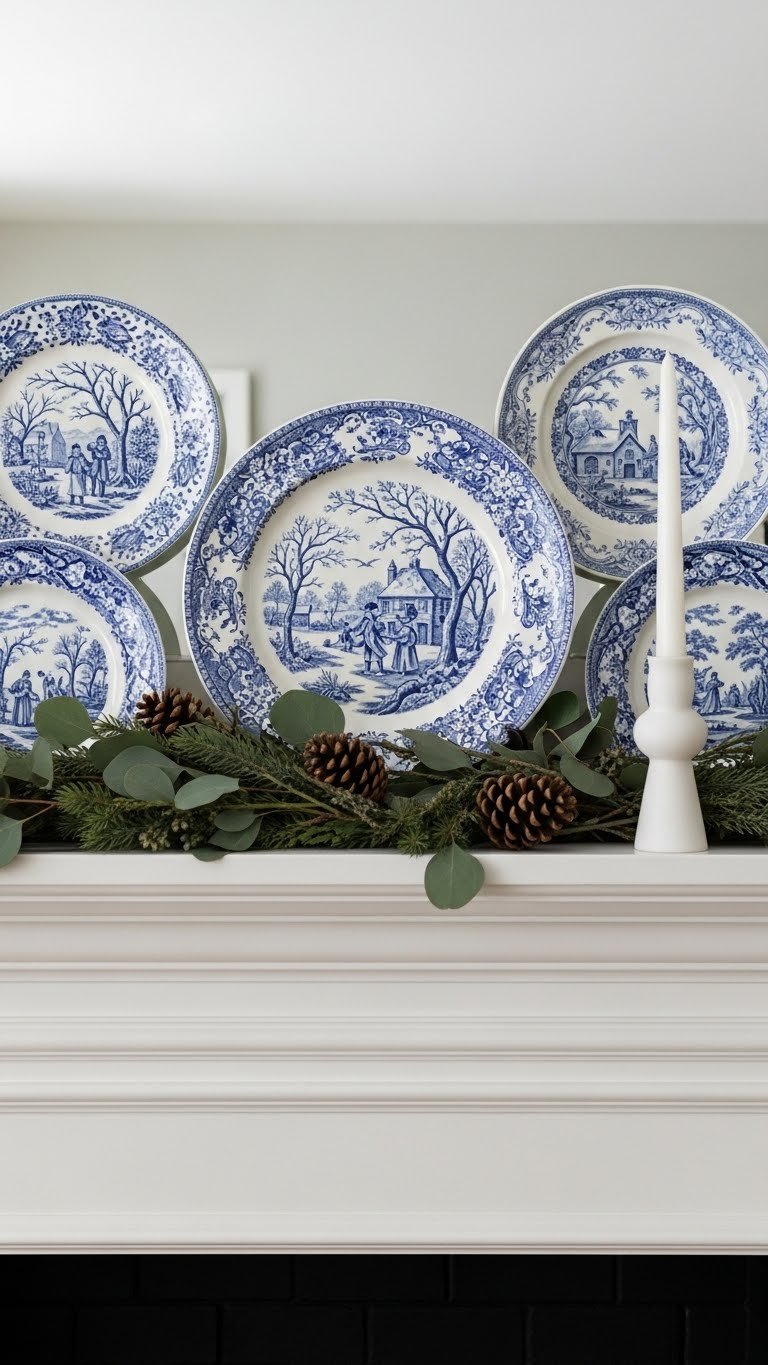 A winter toile mantel with porcelain plates transforms your fireplace into a refined focal point, mixing delicate narrative patterns with cool, glossy whites to evoke seasonal charm without fuss.