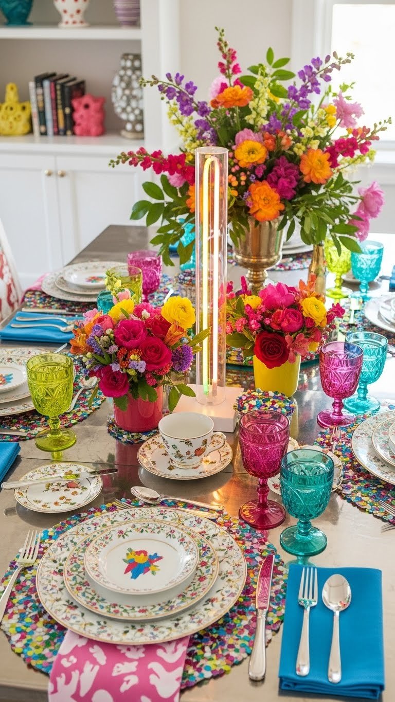 You layer bold patterns, set confetti chargers beneath plates, and anchor the scene with a sculptural neon centerpiece. Embrace fearless combinations, mix metallics and matte, and let each place setting celebrate playfulness with deliberate, joyful intent.