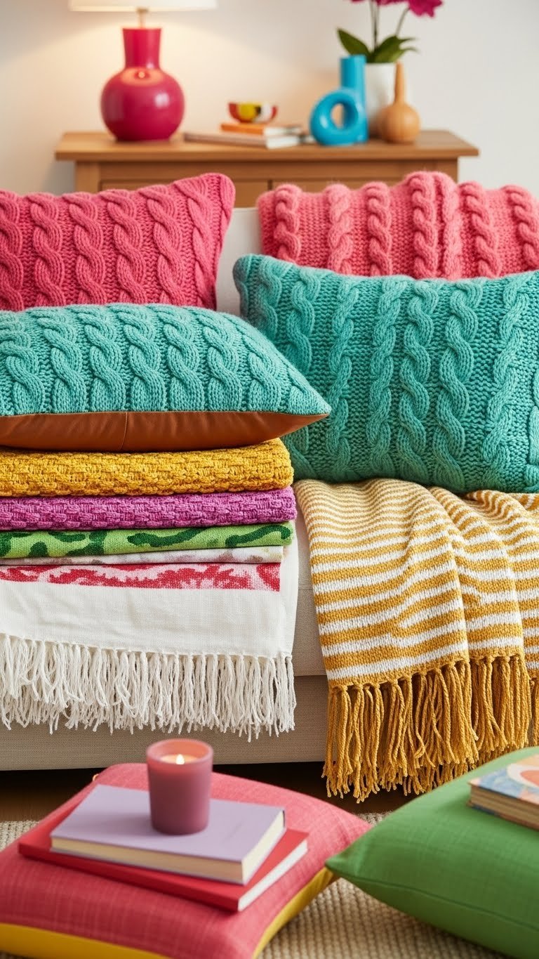 You’ll mix cable knit cushions, leather trimmed blankets, and lightweight linen throws for texture and warmth. Drape strategically, alternate scale and pattern, and keep a curated, effortless look that encourages cozy freedom and relaxed elegance.