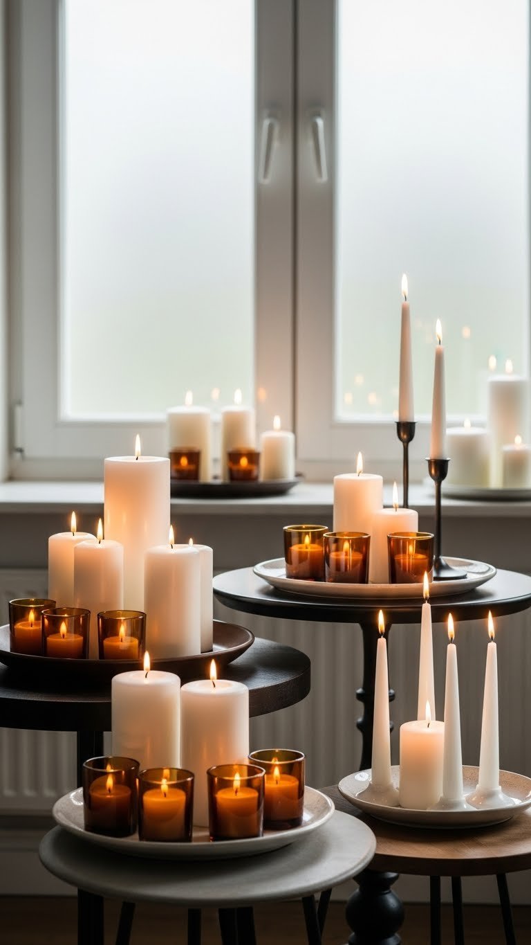 Frosted window treatments soften daylight; candlelit clusters on side tables pick up that muted glow and carry it into the evening. You’ll arrange varied heights—pillars, tapered, amber votives—on tea trays or shallow dishes, balancing scale and negative space. Keep metal minimal, choose unscented candles for clear ambiance, and rotate placements so each night feels intentional and free, never cluttered.
