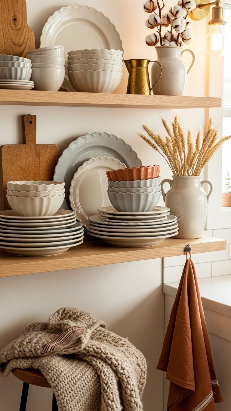 After you’ve layered textiles for warmth, bring that same tactile attention to your kitchen by styling scalloped dishes on open shelving for a seasonal mood. Let pieces in neutral glaze and muted terracotta anchor a relaxed, curated stack. Mix plates, bowls, and a few vintage finds; leave negative space so each scallop reads like artwork. Rotate accents for effortless winter refreshes.