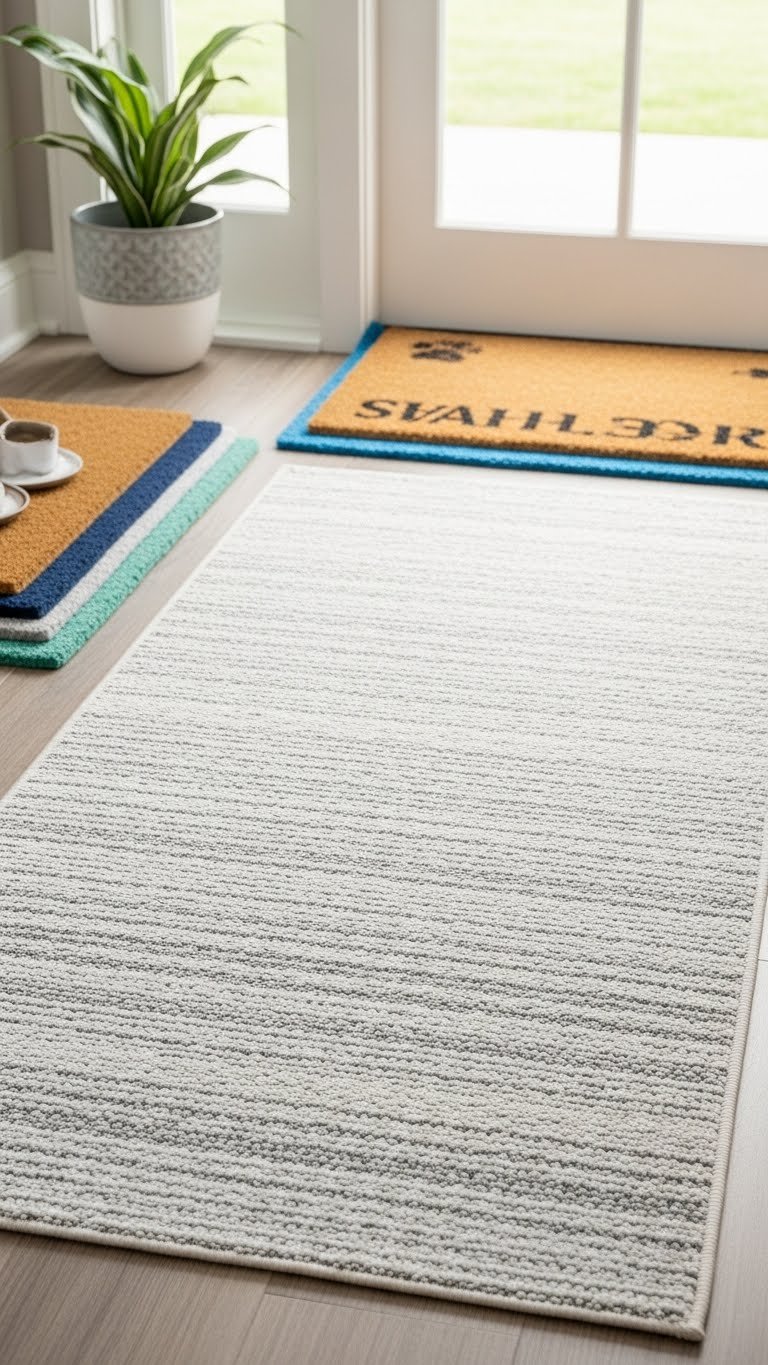You’ll place runners at entryways with Threshold Anchors and layer washable mats near doors and pet areas. Schedule Rug Rotation to extend wear, swap seasonal colors, and maintain freshness. Choose low-profile, quick-dry weaves so you can wash, hang, and reclaim your space fast.