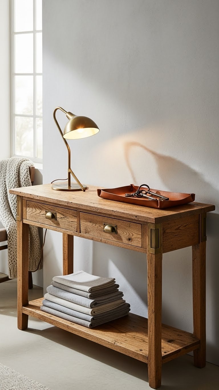 Anchor your entryway with a vintage-inspired console that pairs warm brass accents with timeworn wood grain to create instant character and practical elegance. You’ll choose pieces with graceful vintage silhouettes and solid brass hardware for tactile luxury.