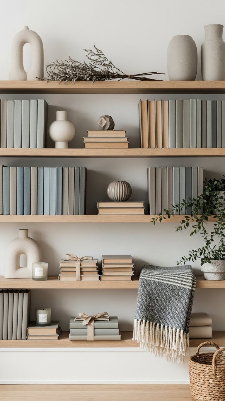 Want your bookshelf to feel like a quiet winter vignette? You’ll arrange vintage spines by tone, leaving negative space for calm.